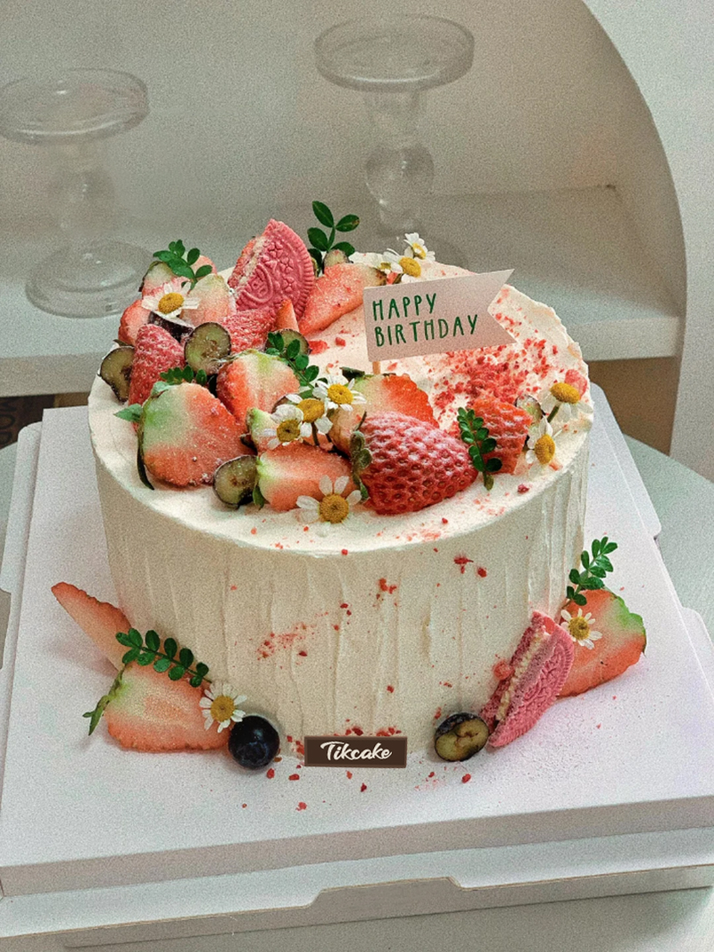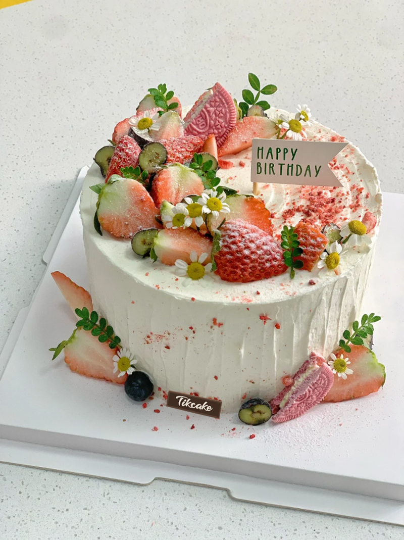 内层蛋糕胚 奶油(含水果果肉)叠层,表层草莓,饼干,鲜花等装饰