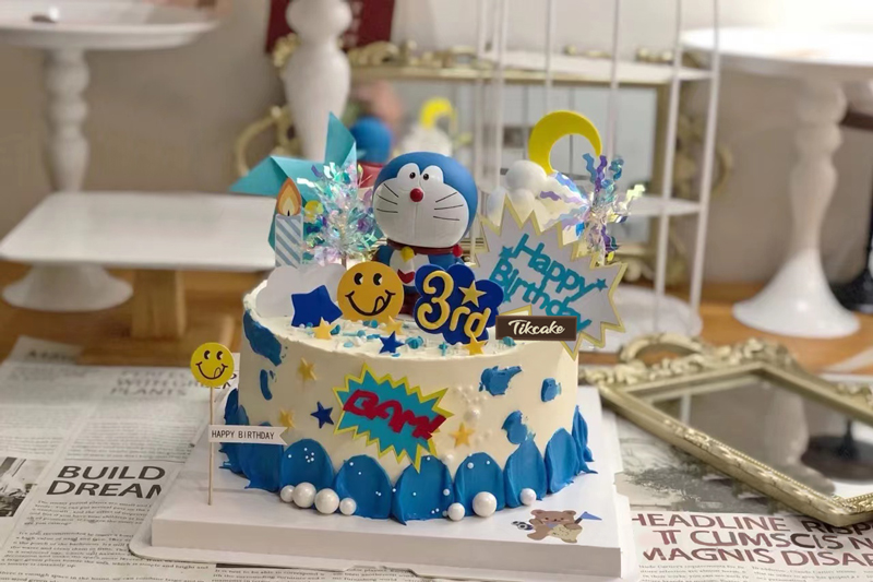 内层蛋糕胚 奶油叠加(含水果果肉),表层哆啦a梦主题摆件等装饰