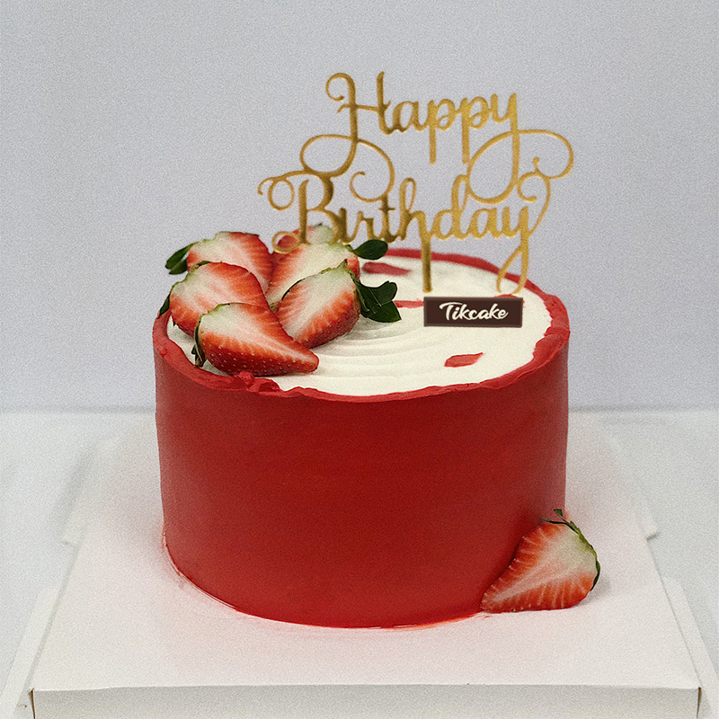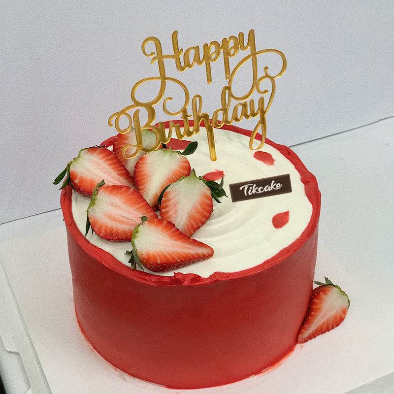 蛋糕胚 奶油(含水果果肉)叠加,表层草莓 生日快乐插牌等装饰。