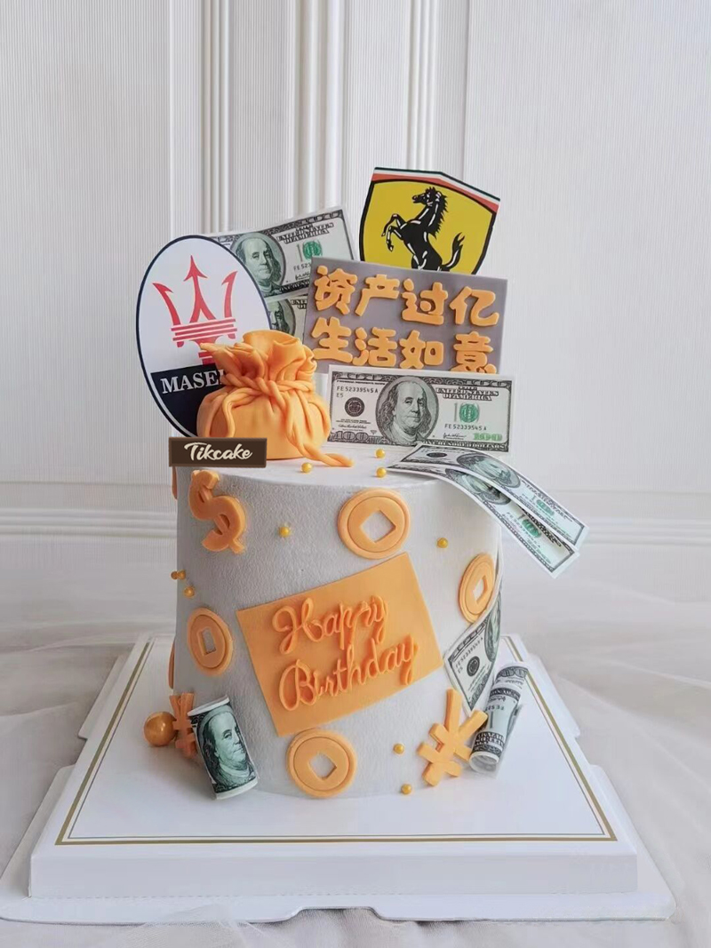 加高款。内层蛋糕胚 奶油叠加(含水果果肉),表层翻糖皮等装饰(注:图中钞票为糯米纸装饰道具)