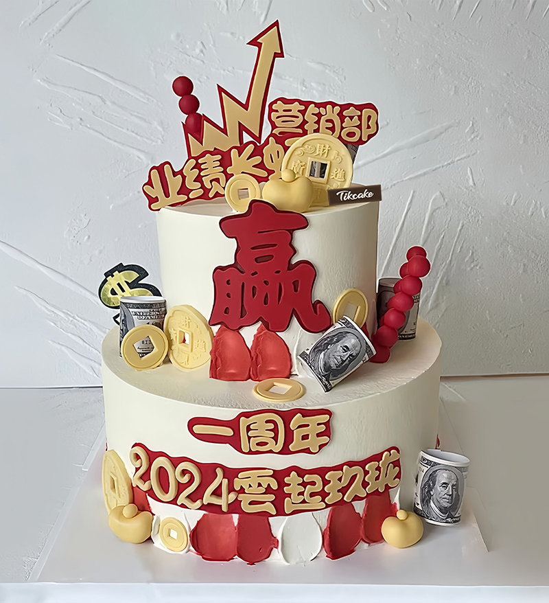 内层蛋糕胚 奶油叠加(含水果果肉),表层翻糖皮等装饰(文案可定制,请下单时留言。注:图中钞票为糯米纸装饰道具)