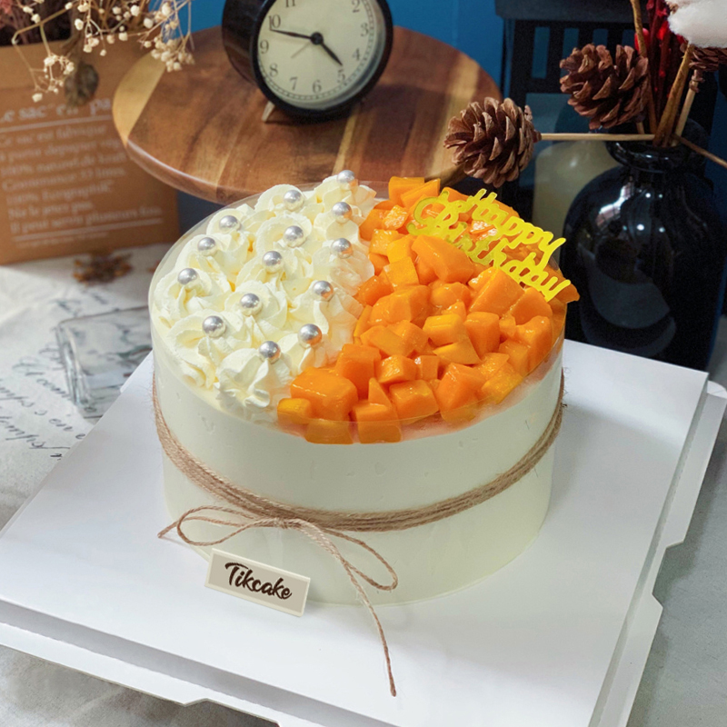 内层蛋糕胚 奶油(含水果填充)叠加,表层丰满芒果果肉、白色糖珠、生日插牌装饰
