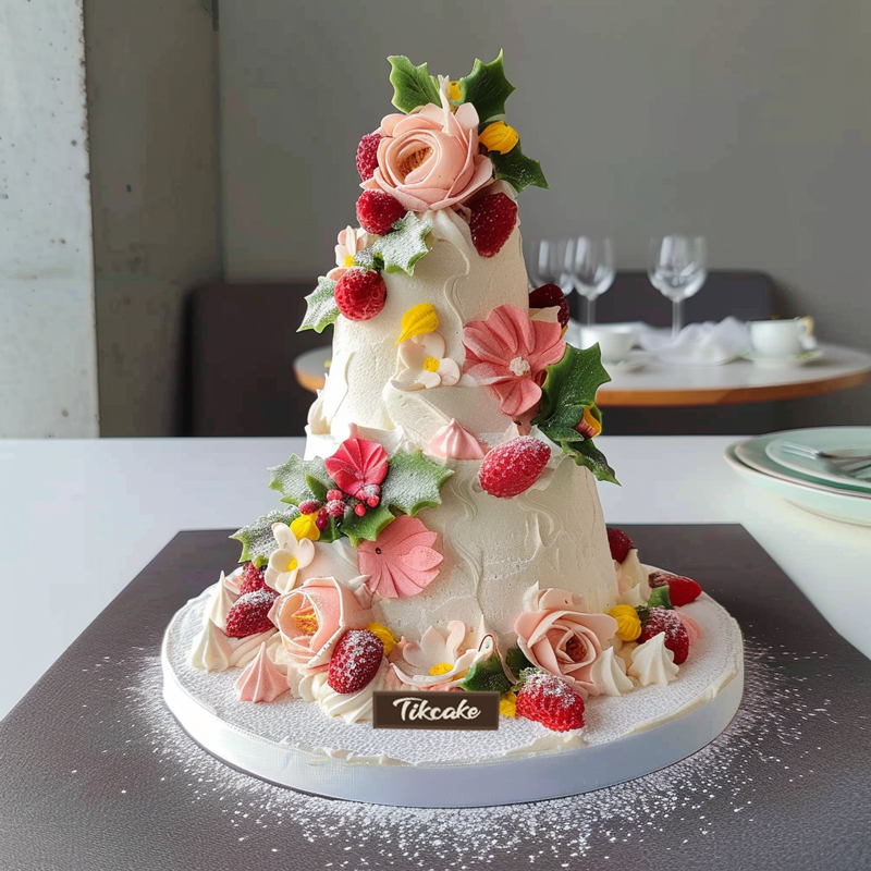 内层蛋糕胚 奶油(含水果果肉)叠加,表层奶油、裱花、翻糖皮等装饰