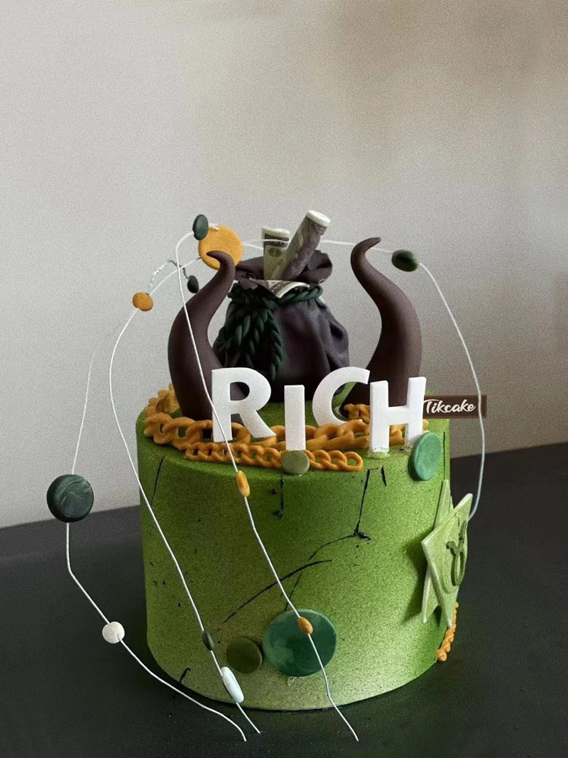 内层蛋糕胚 奶油叠加(含水果果肉),表层福袋,牛角主题等翻糖皮装饰(注:图中钞票为糯米纸装饰道具。此款含有适量可食用色素,介意者慎拍)